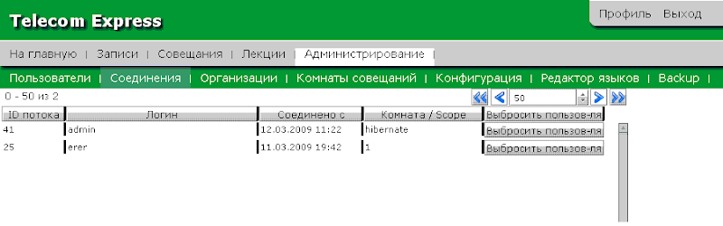 - Каждый пользователь может иметь несколько физических соединений одновременно, даже в случае если он работает с Телесовещаниями в одной вкладке браузера. В общем случае при входе в систему создаётся одно соединение типа «Клиент». Если пользователь запускает аудио/видео поток, для него порождается новое соединение типа «Экранный Клиент». Для функционала «Общий экран» создаётся ещё одно физическое соединение типа «Общий экран». Фактически, эти соединения — это сессии пользователя, имеющие свой внутренний идентификатор потока. Каждая такая сессия передаёт сообщения/пакеты независимо от других сессий данного пользователя. Поле «Логин» заполняется только для родительской сессии типа «Клиент», и только эту сессию можно принудительно отключить, что автоматически повлечёт удаление других сессий данного пользователя.